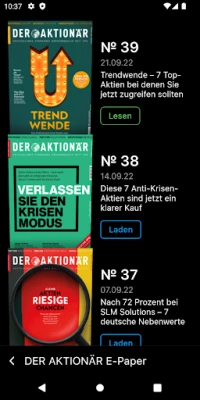 Descoperiți universul bursier la îndemână cu DER AKTIONÄR-App, instrumentul esențial pentru investitorii moderni. Această aplicație vă oferă acces fără precedent la toate edițiile digitale ale publicației DER AKTIONÄR, serviciilor bursiere premium și rapoartelor speciale, direct pe dispozitivul dumneavoastră mobil. Fie că preferați citirea în format portret sau vizualizarea extinsă pe două pagini în format peisaj, veți beneficia de o experiență de lectură optimă. Mai mult, ediția curentă a revistei DER AKTIONÄR devine disponibilă imediat după încheierea redacției, în fiecare miercuri, permițându-vă să fiți mereu cu un pas înainte în piața financiară.