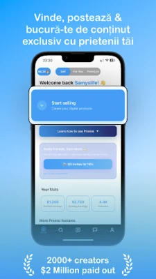 Indiferent dacă ești fotograf, coach, influencer, muzician sau artist vizual, Premsi este construit pentru a-ți amplifica prezența și a-ți diversifica fluxurile de venit. De la instructori de fitness la creatori de cursuri educaționale, platforma noastră mobil-optimitzată te ajută să monetizezi expertiza și talentul tău. Colectează puncte Premsi pentru vizibilitate sporită și conectează-te profund cu fanii tăi, transformând creativitatea într-un succes financiar durabil. Începe-ți călătoria antreprenorială digitală și descoperă potențialul maxim al creațiilor tale.